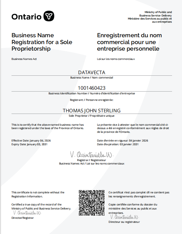 Datavecta is a legally registered business entity in Ontario, Canada, with its registration details recorded in the Ontario Business Registry. This public registry enables independent verification of a company’s legal status, registration particulars, and effective dates through official government platforms. Users and partners can access relevant registration information by searching for the company name “Datavecta” or using its registered business number in the Ontario Business Registry.
